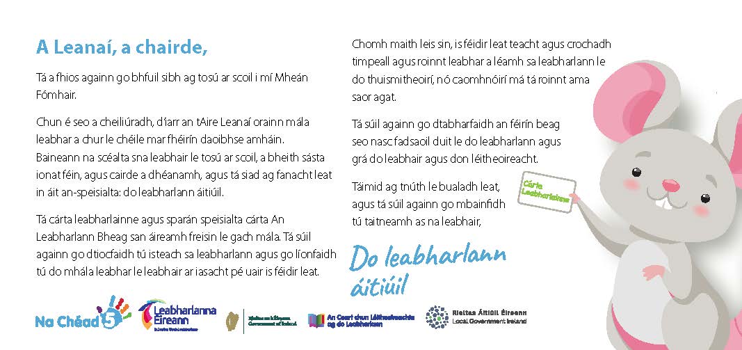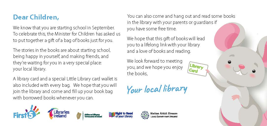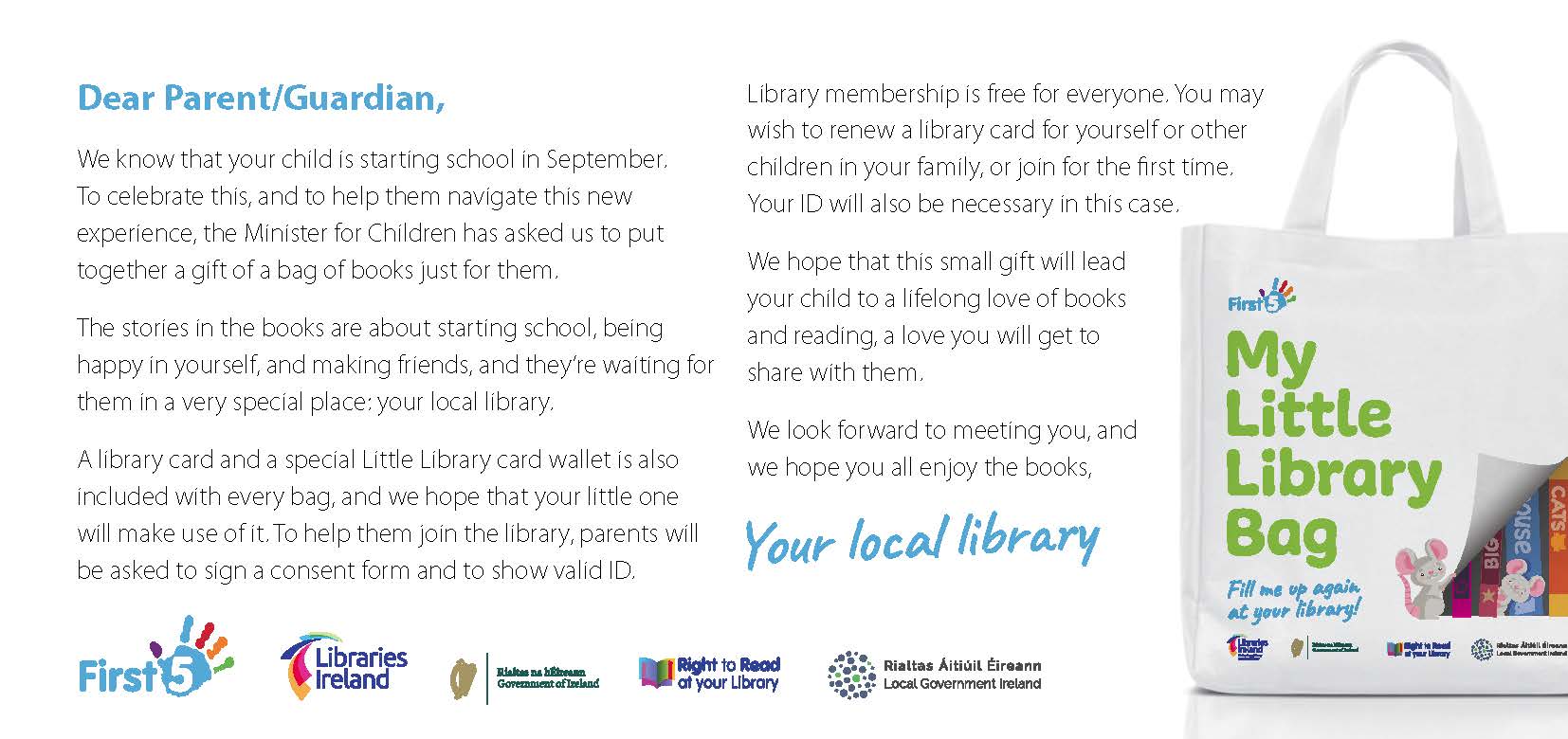 The ‘My Little Library Book Bag’ initiative is a collaboration between libraries, the Department of Rural and Community Development, and the Department of Children, Equality, Disability, Integration and Youth as part of the First 5 Strategy.