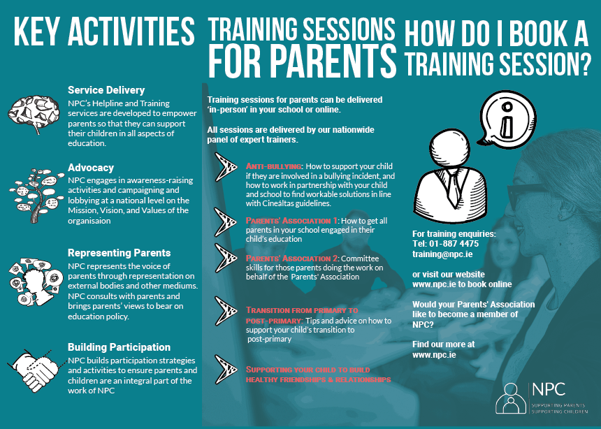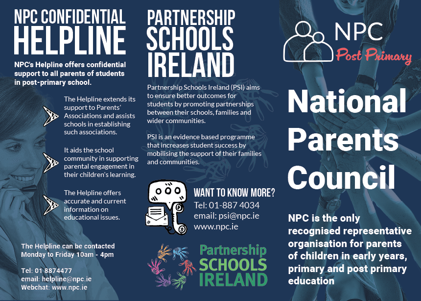 Should you have any specific queries regarding your child in school, or regarding any of our services please don't hesitate to contact the NPC Helpline Tel: 01 8874477 or email: helpline@npc.ie