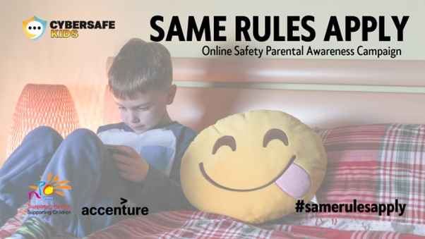 We are delighted to share our latest online safety parental awareness campaign 'Same Rules Apply', which we are launching today as part of Safer Internet Day. In partnership with CyberSafeKids ( https://www.cybersafekids.ie/ ) and supported by Accenture, this campaign highlights the need to approach parenting children 'online' in the same way that we approach parenting them 'offline'.