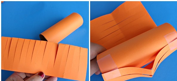 The first thing to do is wrap a toilet paper roll in orange paper then fold another sheet of paper in half and cut slits in it you can measure the height of the toilet roll first and if it a little long – you can cut it to fit. After that tape both ends to one side of the toilet roll, make sure the middle sticks out further.