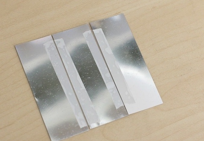 3. Line up your mirrored strips, leave a tiny space between each one. (Place the shiniest/least scratched sides face down.) Tape them together over the spaces.