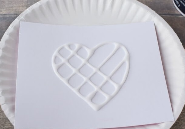 1. Use white glue to draw a design or picture onto a piece of card. I like to cut small pieces that fit onto a paper plate.