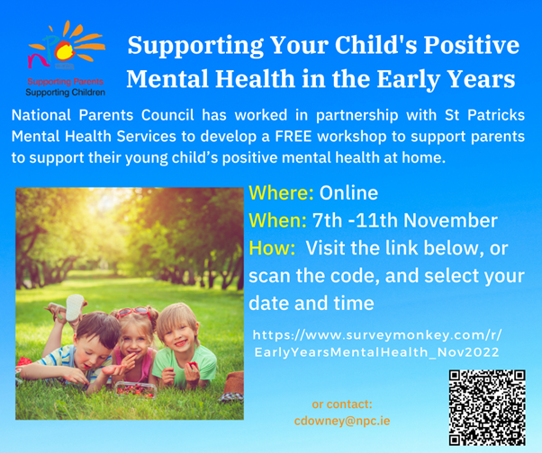 National Parents Council Primary(NPC) would like to invite you to a FREE online information session for parents of children in early years’ education around the topic of “Supporting your child’s positive mental health in the early years”.