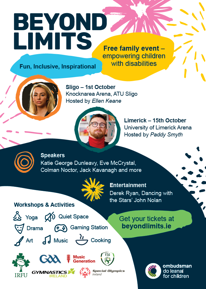 Beyond Limits is a festival style event with speakers, activities, workshops and performances. Children and families will be inspired and motivated by the stories of children with disabilities, and some well-known faces. The GAA, the IRFU, the FAI and Gymnastics Ireland will be there showing children how they can get involved. There will be a silent disco, sensory stories, arts and craft, yoga and mindfulness. There is something for everyone!